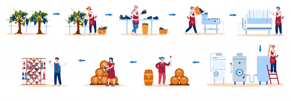С точки зрения технологии производства, предусмотрены следующие этапы: сбор винограда, его доставка на винодельню, приемка, охлаждение, переработка винограда, брожение на мезге, стекание и прессование мезги, выдержка виноматериала в бочках, ассамбляж, фильтрация, розлив, выдержка вина в бутылке, оформление готовой продукции, поступление на склад готовой про